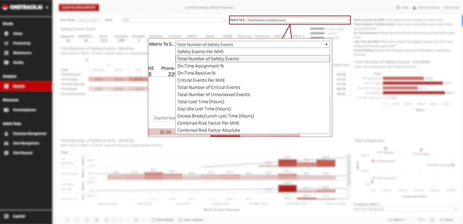 Lastly, do a site comparison on this dashboard view, and filter by “Total safety events”. This stack ranks your warehouse safety events by site while taking into account how many MHE are actually at each site.